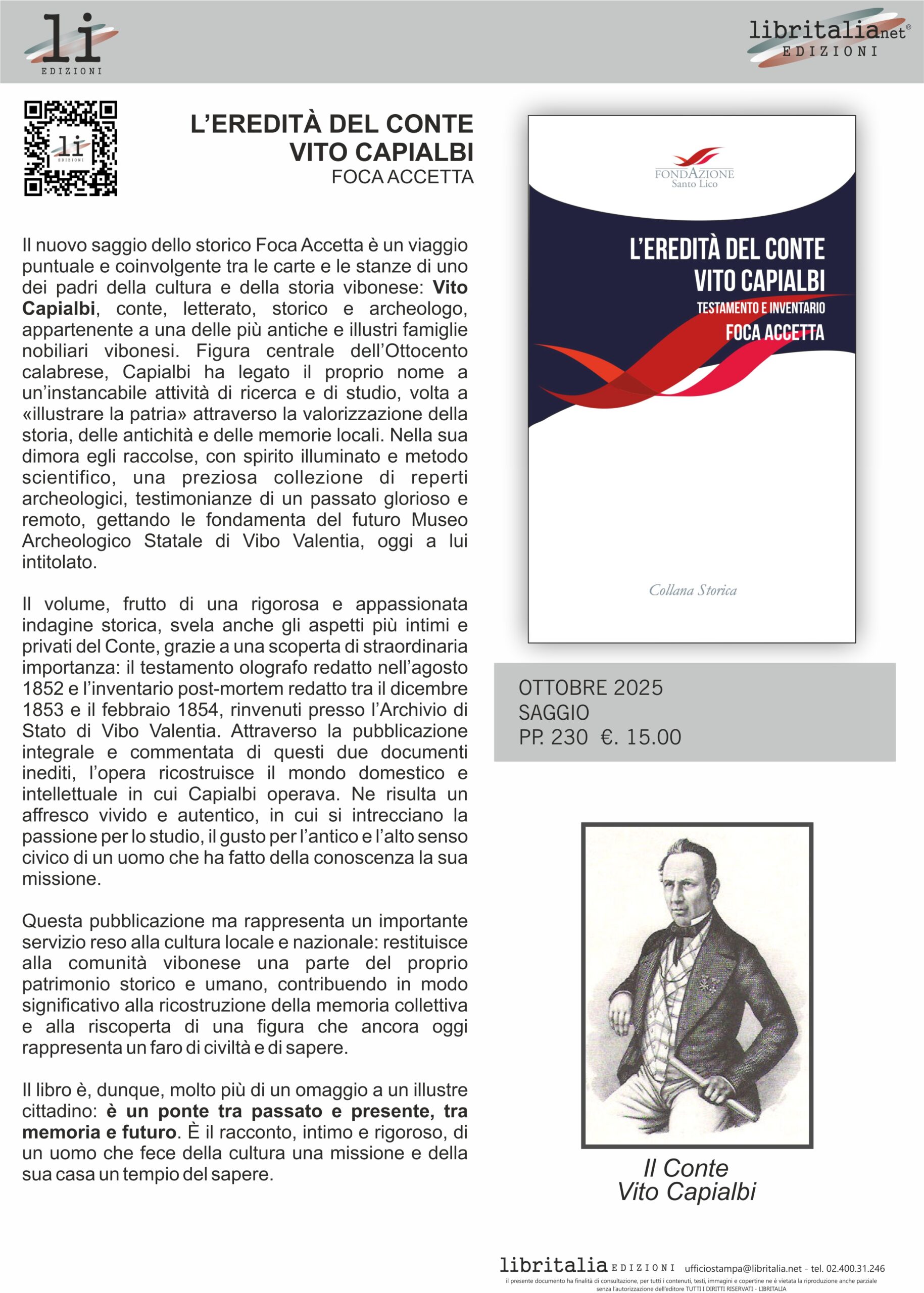 L’eredità del Conte Vito Capialbi – Testamento e Inventario a cura di Foca Accetta – Collana Storica edito da Libritalia per conto di Fondazione Santo Lico