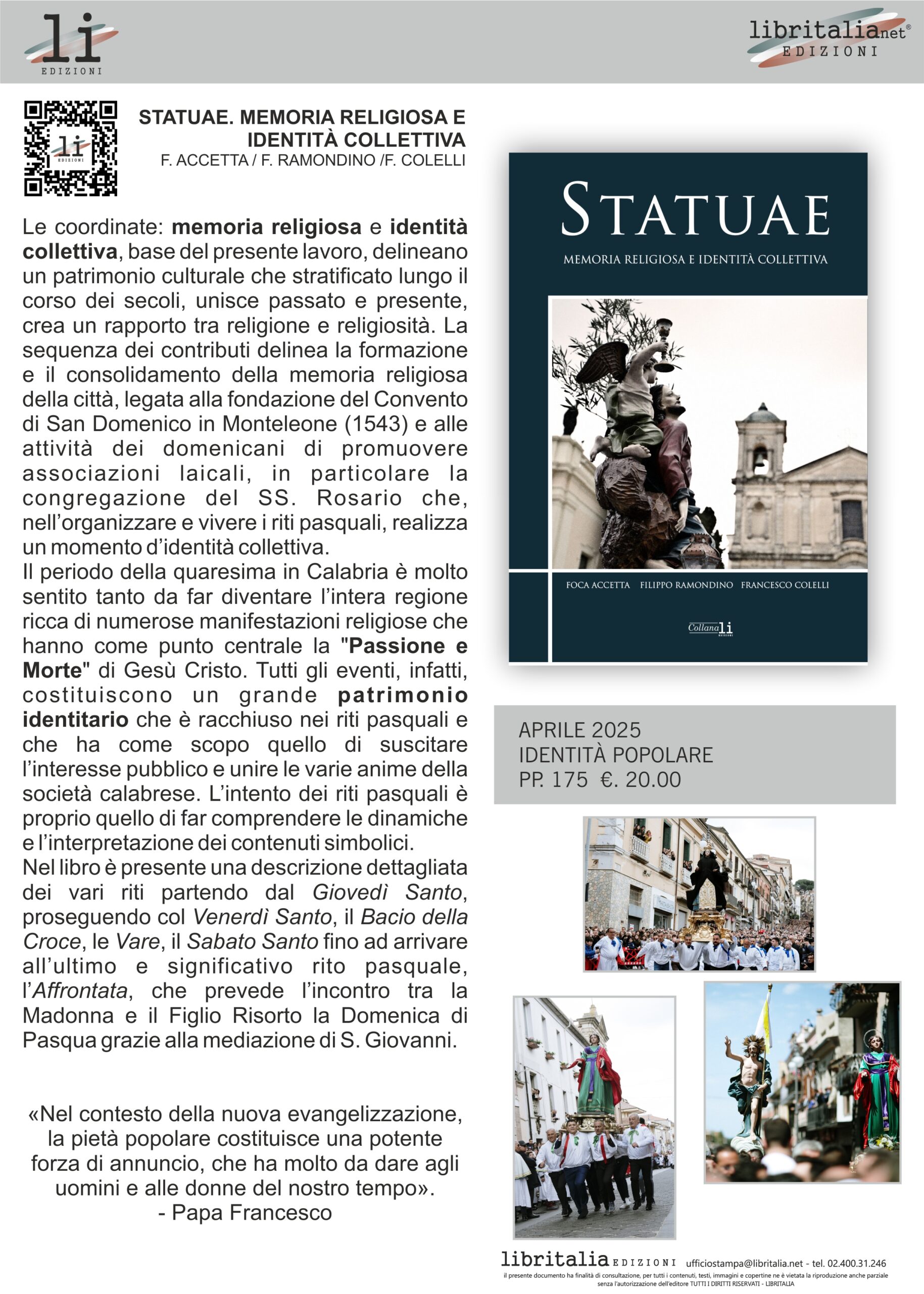 Statuae – Memoria religiosa e identità collettiva a cura di Foca Accetta, Filippo Ramondino, Francesco Colelli. Galleria Fotografica a cura di Franco Grillo e Attilio Scullari, edito da Libritalia Collana Li Edizioni
